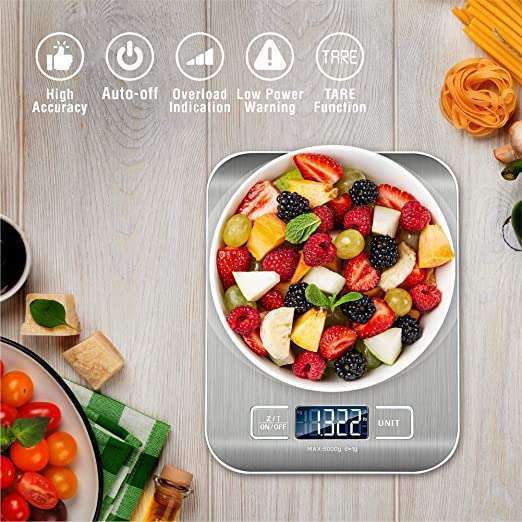 - ✅ MULTIPURPOSE DESIGN: This stylish scale for kitchen is a great solution for people who love cooking or who like portion control. The kitchen weight scale is very easy to clean and features an anti-fingerprint coating. It has a maximum capacity of 5 kg with an overload indicator for more safety.