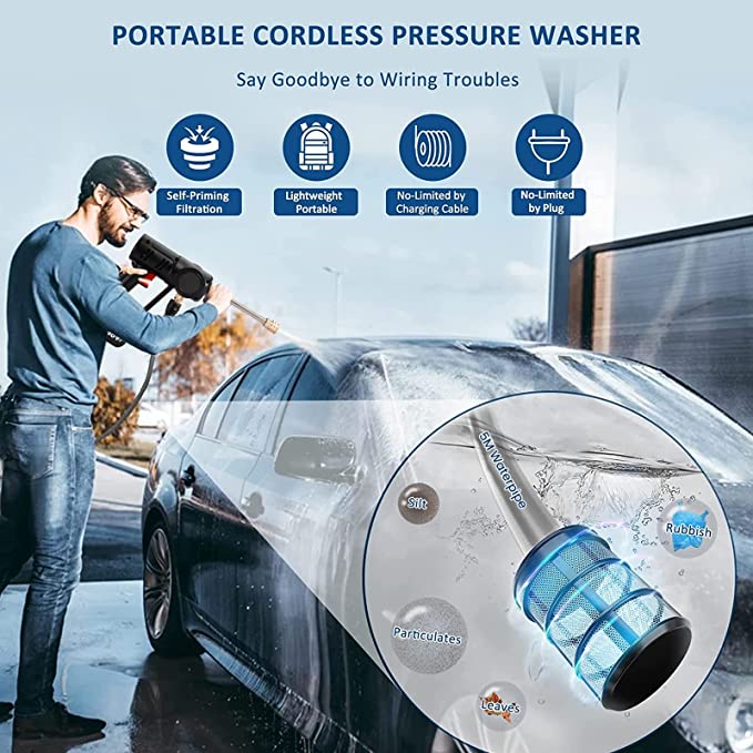 - 【Portable Pressure Washer】Our cordless pressure washer is lightweight, wireless, and easy to assemble, disassemble and carry. You can use it anytime, anywhere. No need to worry about water supply, because it can take water from taps, rivers, buckets, and even water bottles. You can take it to the garden, vegetable garden, or outdoors.
